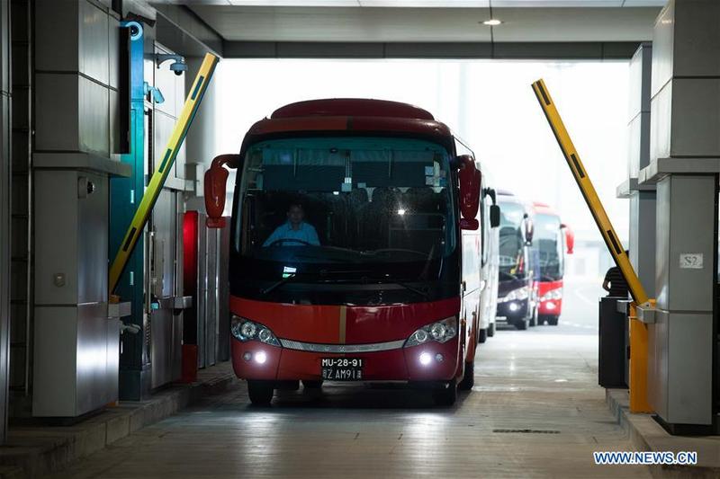 A shuttle bus goes through the Macao port of the Hong Kong-Zhuhai-Macao Bridge, Oct. 24, 2018. The Hong Kong-Zhuhai-Macao bridge, the world's longest cross-sea bridge, opened to public traffic at 9 a.m. Wednesday. [Photo/Xinhua]