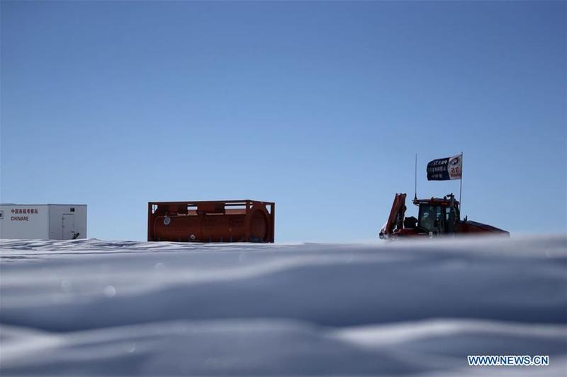 A tractor of China's 35th Antarctic expedition team run through ice knolls in Antarctica on Dec. 31, 2018. The expedition team, expected to arrive at Kunlun Station in five days at about 4,000 meters above the sea level near Dome A, entered into the Antarctic Plateau on Monday. [Photo/Xinhua]