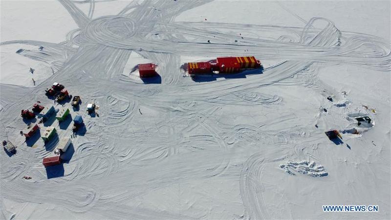 Aerial photo taken on Jan. 13, 2019 shows the camp of one of two inland expedition teams on China's 35th Antarctic expedition (L), China's Kunlun Station (C), and the drilling equipment (R) at the Kunlun Station in Antarctica. [Photo/Xinhua]