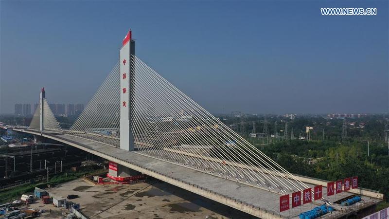 This aerial photo taken on July 30, 2019 shows two parts of a bridge above the Beijing-Guangzhou Railway after they are successfully rotated to their targeted positions using the swivel construction method in Baoding, north China's Hebei Province. [Photo/Xinhua]