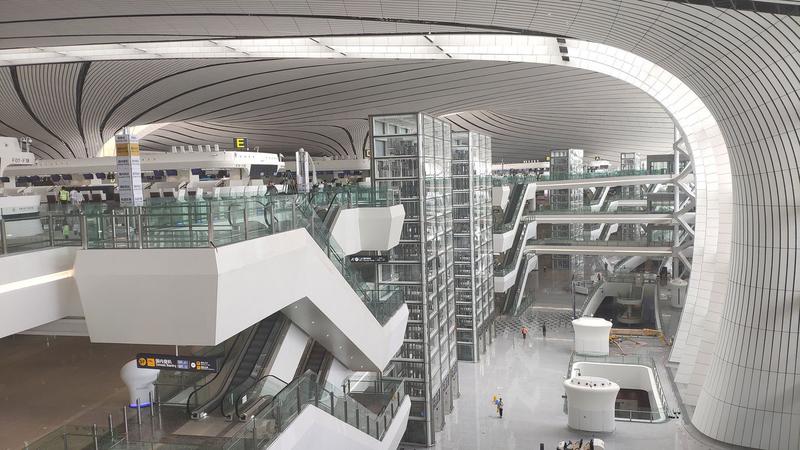 Elevators and escalators inside the seven-story terminal hall of the Beijing Daxing International Airport. [Photo/chinadaily.com.cn]