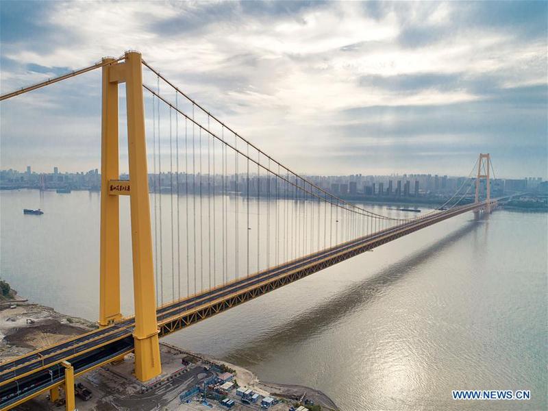 Aerial photo taken on Sept. 25, 2019 shows the Yangsigang Yangtze River bridge in Wuhan, capital of central China's Hubei Province. The double-deck suspension bridge with the longest span in the world opened to traffic in Wuhan on Oct. 8. The double-deck road bridge over the Yangtze River, with a 1,700-meter-long main span, stretches 4.13 km in total length. The top deck of the 10th Yangtze River bridge has six lanes with a designed speed of 80 kph while the bottom deck also has six lanes but with a designed speed of 60 kph. [Photo/Xinhua]