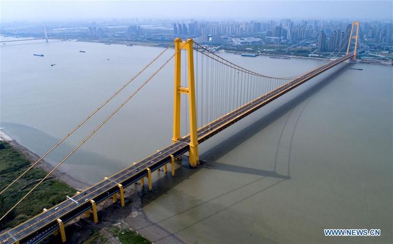 Aerial photo taken on Oct. 8, 2019 shows the Yangsigang Yangtze River bridge after opening to taffic in Wuhan, capital of central China's Hubei Province. The double-deck suspension bridge with the longest span in the world opened to traffic in Wuhan on Oct. 8. The double-deck road bridge over the Yangtze River, with a 1,700-meter-long main span, stretches 4.13 km in total length. The top deck of the 10th Yangtze River bridge has six lanes with a designed speed of 80 kph while the bottom deck also has six lanes but with a designed speed of 60 kph. [Photo/Xinhua]