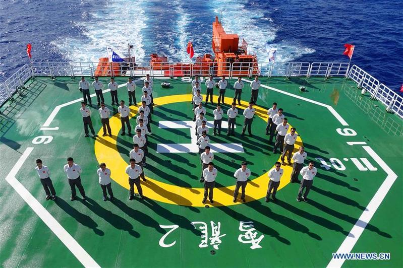 Members of China's 36th Antarctic expedition team pose for photos aboard Xuelong 2 to mark its crossing the equator, Oct. 24, 2019. China's first domestically made polar icebreaker Xuelong 2, or Snow Dragon 2, crossed the equator and entered the southern hemisphere for the China's 36th Antarctic expedition after it started its maiden voyage from the southern Chinese city of Shenzhen on Oct. 15. [Photo/Xinhua]