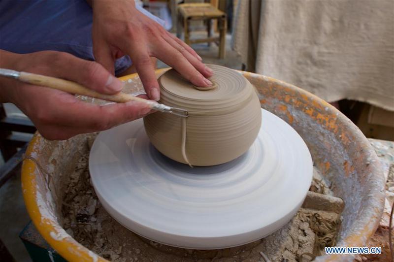 A craftsman processes unburnt earthenware in Dehua County of Quanzhou, southeast China's Fujian Province, May 15, 2018. Dehua, as China's famous ceramics base, has some 2,600 ceramic companies and over 100,000 related employees. The county has promoted electric kiln to protect environment and pushed forward whole industrial chain of ceramics. In 2017, the output value of ceramic industry in Dehua reached US$3.58 billion. [Photo/Xinhua]