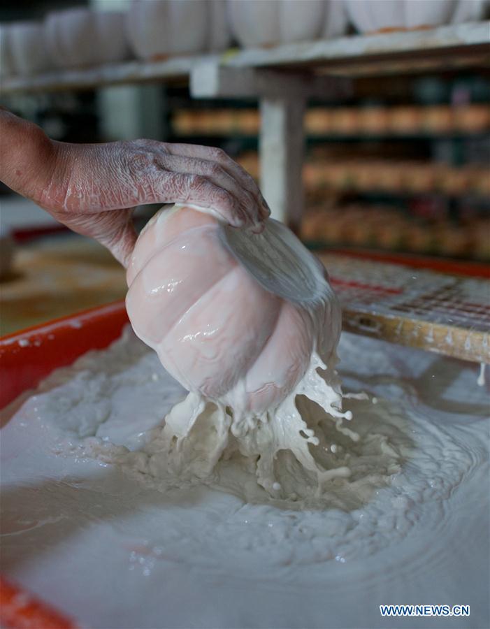 A worker glazes a ceramic product at a company in Dehua County of Quanzhou, southeast China's Fujian Province, May 15, 2018. Dehua, as China's famous ceramics base, has some 2,600 ceramic companies and over 100,000 related employees. The county has promoted electric kiln to protect environment and pushed forward whole industrial chain of ceramics. In 2017, the output value of ceramic industry in Dehua reached US$3.58 billion. [Photo/Xinhua]