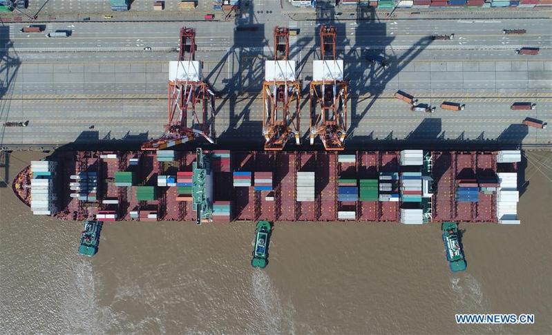Aerial photo taken on April 23, 2017 shows a container dock of Yangshan Port in Pudong of Shanghai, east China. China announced the opening-up and development of Pudong in 1990. Pudong is expecting to take the opportunity of celebrating the 40th anniversary of China's reform and opening-up to continue to spearhead the country's reform and development. [Photo/Xinhua]