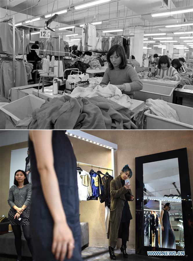The upper part (file) of this combo photo taken by Duan Wenhua shows employees working at a clothing factory in Shenzhen, south China's Guangdong Province. The lower part of the combo photo taken by Mao Siqian on March 28, 2015 shows fashion designer Lu Yu (R) at her studio in Shenzhen. This year marks the 40th anniversary of China's reform and opening-up policy. Over the past four decades, Shenzhen has developed from a small fishing village to a metropolis. [Photo/Xinhua]