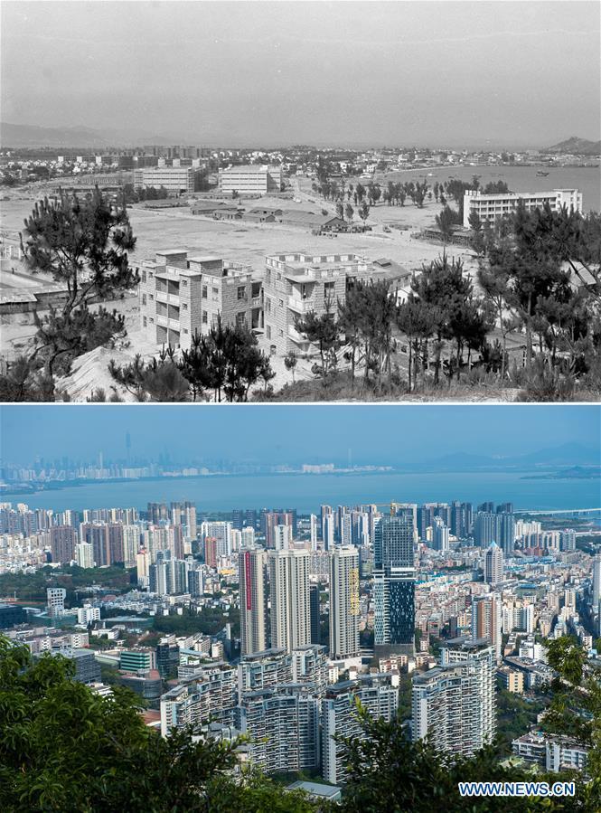 The upper part (file) of this combo photo taken by Li Changyong shows Shekou industrial zone in Shenzhen, south China's Guangdong Province. The lower part of the combo photo taken by Mao Siqian on Feb. 26, 2015 shows Shekou area of China (Guangdong) Pilot Free Trade Zone in Shenzhen. This year marks the 40th anniversary of China's reform and opening-up policy. Over the past four decades, Shenzhen has developed from a small fishing village to a metropolis. [Photo/Xinhua]