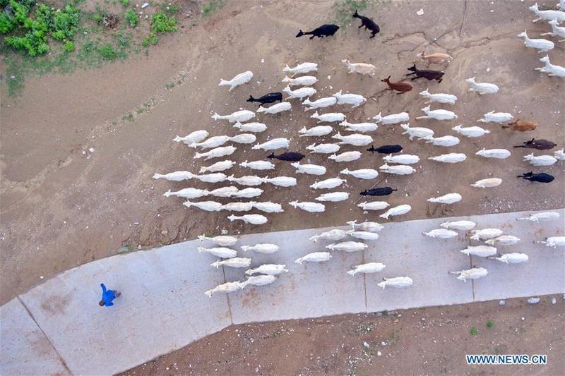 Aerial photo taken on July 14, 2018 shows the alpacas on the hill in Yangqu County of north China's Shanxi Province. Liu Xuerong, a poverty-stricken farmer from Pingli Village of Yangqu County, has never dreamed of getting rich with a flock of cute alpacas. In 2014, as a breeding base of a thousand alpacas was built, Liu started embarking on cultivating those Australia-originated alpacas. The breeding base makes a profit from cub breeding, woolen products and tourism of alpaca watching. Liu accordingly earns a monthly wage of 3000 yuan (US$449). Yet in the past, Liu's family relied on growing agricultural products such as corns and potatoes for their livelihoods, with an annual salary of 6000 yuan (US$897). More than 30 poverty-stricken households in Pingli Village have got rid of poverty, with a monthly wage raise of 2000 yuan (US$299). In the next few years, the alpaca breeding base will further expand the reproduction scale, while perfecting management mode, to help promote the poverty relief work. [Photo/Xinhua]