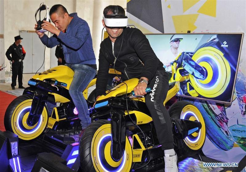 Purchasers try VR motorcycle games at an expo of Yiwu small commodities in Yiwu, east China's Zhejiang province, Oct. 21, 2018. [Photo/Xinhua]