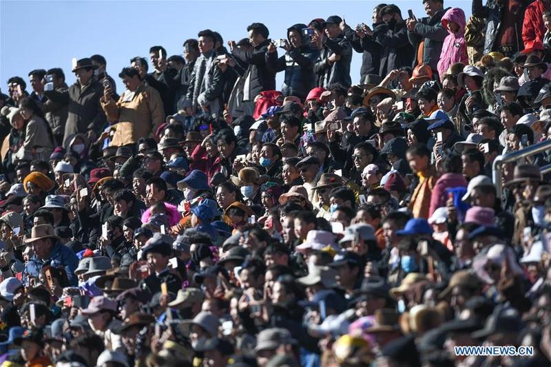 People watch horse race in Lhasa, southwest China's Tibet Autonomous Region, Feb. 7, 2019. Since 1990, horses have been drifting away from plateau life, as most villages are connected to modern road networks these days. In some places, however, horses have regained their status as a mode of transport. Gyumey Dorje lives at the foot of Mt. Gang Rinpoche, a sacred mountain for Tibetans and a hot tourist attraction. There, villagers offer tourists services such as horseback riding or transferring goods up and down the mountain. "The horse is no common livestock," said Ngawang Tenzin from the local culture authority. "The changing status of horses reflects the development of Tibet." [Photo/Xinhua]