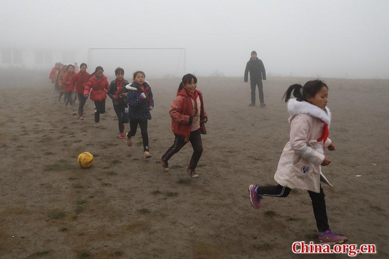 The girls' football team of the Wawu school was formed in September this year with 27 students. This photo shows the girls at their physical training session. [Photo by Chen Weisong/China.org.cn]