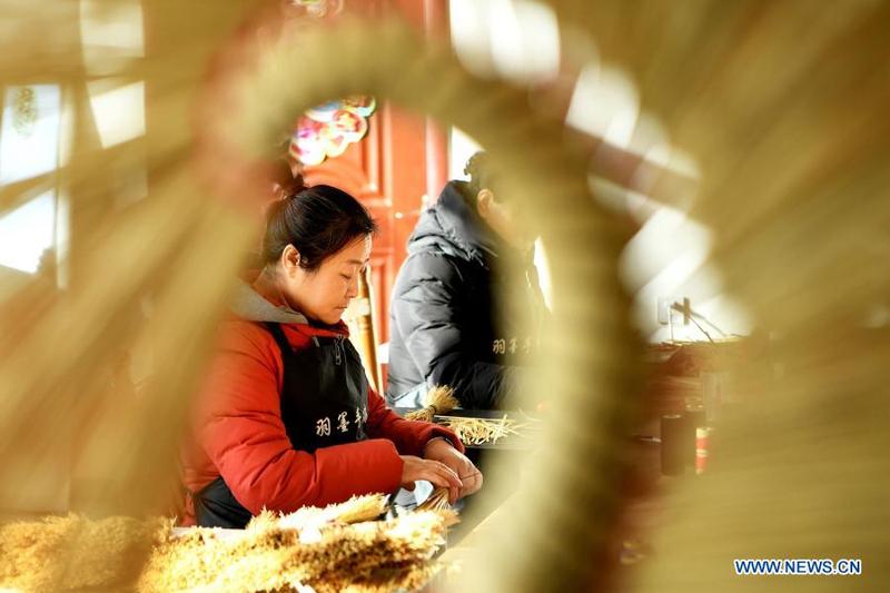Villagers make brooms in Xiongying village of Qiuzhuang township in Langfang city, north China's Hebei province, Dec. 24, 2020. In recent years, Qiuzhuang has strived to develop its broom making industry, as a way to help locals increase incomes. [Photo/Xinhua]