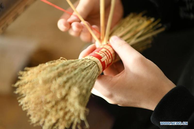 A villager makes a broom in Xiongying village of Qiuzhuang township in Langfang city, north China's Hebei province, Dec. 24, 2020. In recent years, Qiuzhuang has strived to develop its broom making industry, as a way to help locals increase incomes. [Photo/Xinhua]