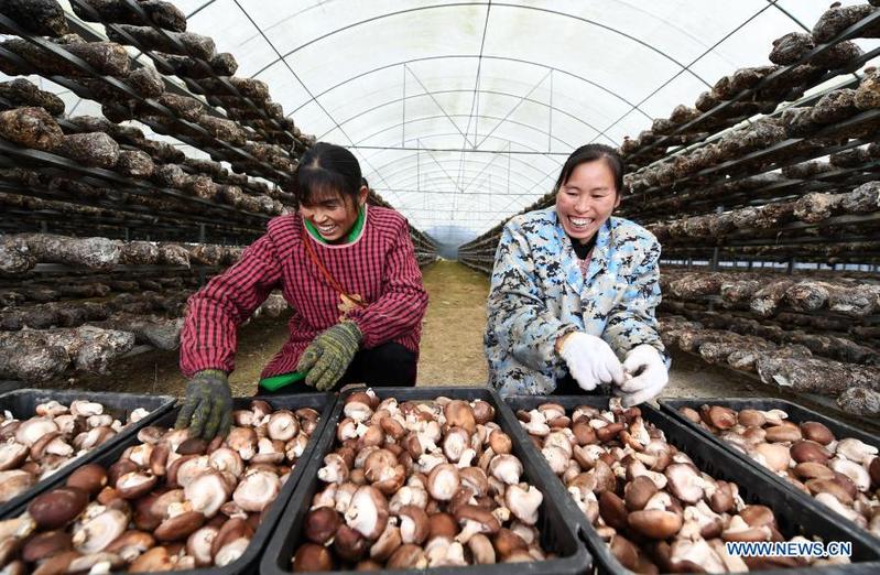 Villagers sort out just-harvested mushrooms at an edible fungus growing base at Minjiachang Village, Minxiao Township in Jiangkou County of southwest China's Guizhou Province, Jan. 3, 2019. Guizhou, which used to be a provincial-level region with the biggest population of poor people, has lifted more than 9 million people out of poverty since 2012. (Xinhua/Yang Wenbin)