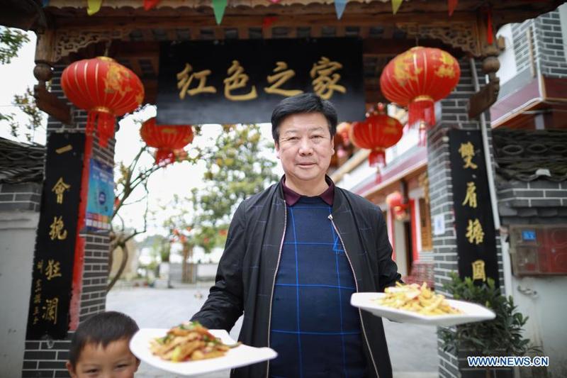 Villager Wang Zhiqiang serves dishes at a home-stay restaurant he runs at Huamao Village, Fengxiang Township, Zunyi City of southwest China's Guizhou Province, April 13, 2020. Guizhou, which used to be a provincial-level region with the biggest population of poor people, has lifted more than 9 million people out of poverty since 2012. (Xinhua/Liu Xu)