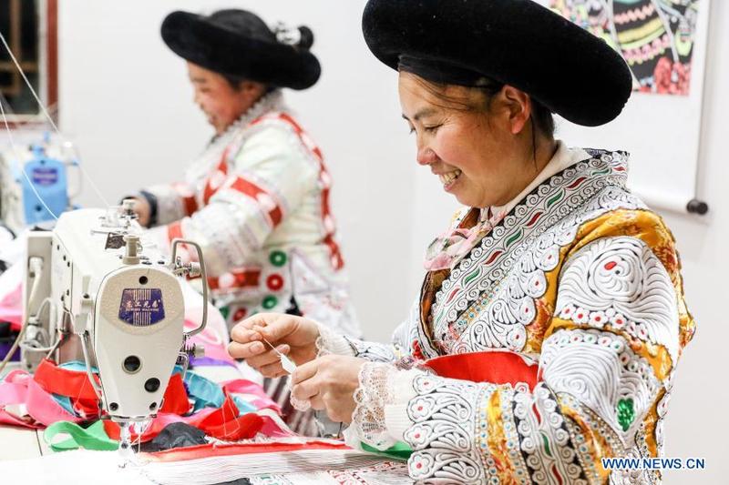 Villagers process garments at a poverty-alleviation workshop in Huawu Village, Xinren Miao Township, Qianxi County, Bijie City of southwest China's Guizhou Province, Feb. 3, 2021. Guizhou, which used to be a provincial-level region with the biggest population of poor people, has lifted more than 9 million people out of poverty since 2012. (Xinhua/Ou Dongqu)