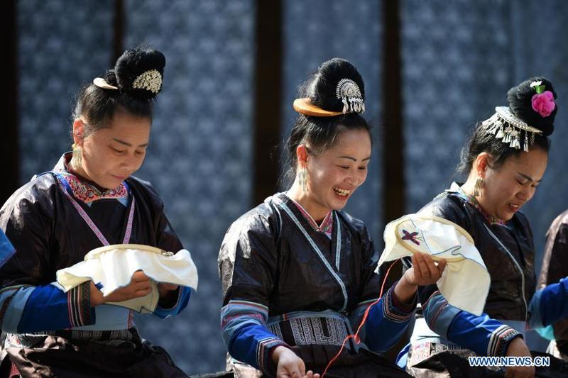 Women of the Dong ethnic group make embroideries at a farmers' cooperative for traditional handicraft in Liping County of southwest China's Guizhou Province, March 12, 2019. Guizhou, which used to be a provincial-level region with the biggest population of poor people, has lifted more than 9 million people out of poverty since 2012. (Xinhua/Yang Wenbin)