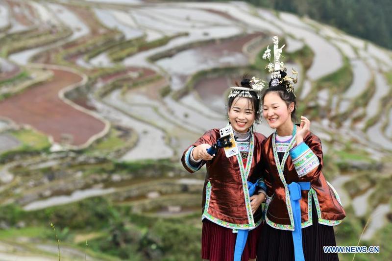Wu Xianyan and college student Liang Qiongying promote local tourism via live streaming at Jiache Village, Jiabang Township in Congjiang County of southwest China's Guizhou Province, April 19, 2020. Guizhou, which used to be a provincial-level region with the biggest population of poor people, has lifted more than 9 million people out of poverty since 2012. (Xinhua/Yang Wenbin)