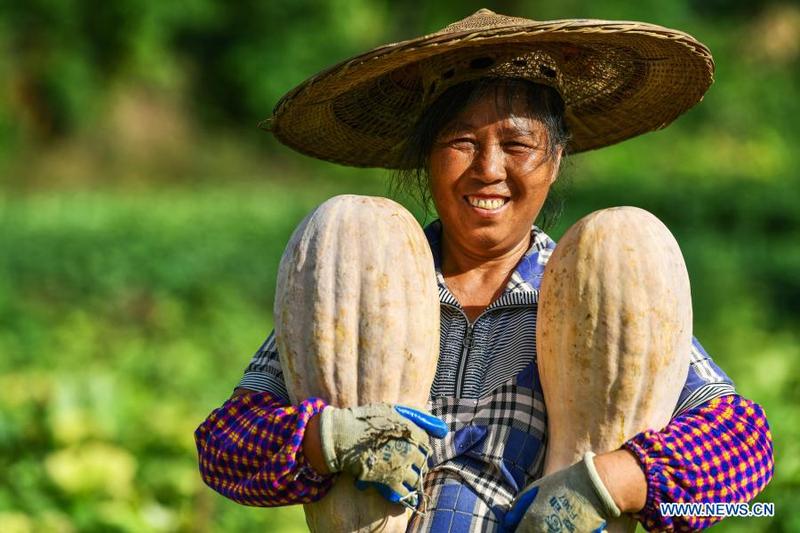 A farmer displays newly-harvested pumpkins in Xujiaba Township, Sinan County of southwest China's Guizhou Province, Aug. 12, 2020. Guizhou, which used to be a provincial-level region with the biggest population of poor people, has lifted more than 9 million people out of poverty since 2012. (Xinhua/Yang Wenbin)
