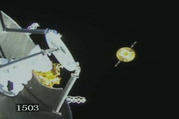 This photo taken by satellite bracket camera of Long March-8 carrier rocket on March 20, 2024 shows the Queqiao-2 relay satellite (C) successfully separating from the carrier rocket with its solar wing and antenna successfully unfolded. (China National Space Administration/Handout via Xinhua)