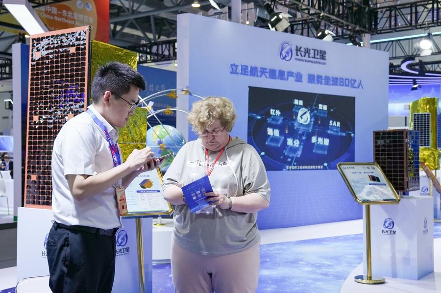 An exhibitor (L) and a guest talk at the 15th China-Northeast Asia Expo in Changchun, northeast China's Jilin Province, Aug. 27, 2025. The 15th China-Northeast Asia Expo kicked off here on Wednesday. (Xinhua/Zhang Nan)