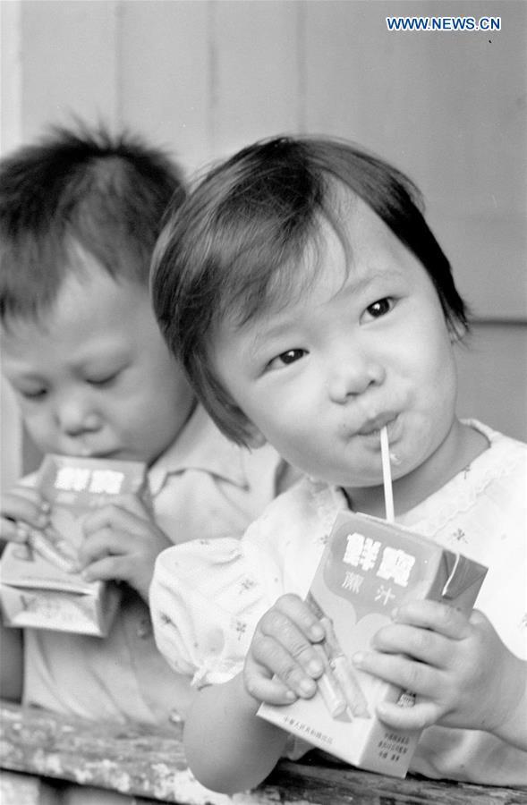 File photo taken on Aug. 19, 1980 shows children drinking juice packed in paper cans which a factory introduced from Sweden in south China's Guangdong Province. [Photo/Xinhua]