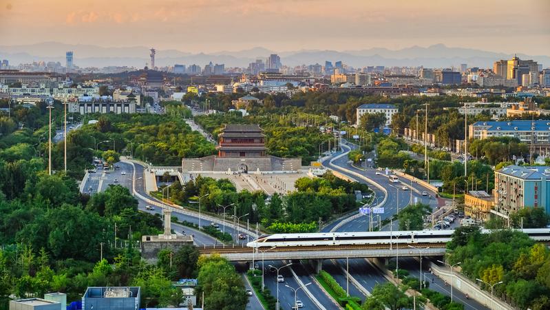 A bullet train, running between Beijing and Tianjin, passes the Yongding Gate, a major landmark on Beijiing's central axis, in July. [Photo/China Daily]