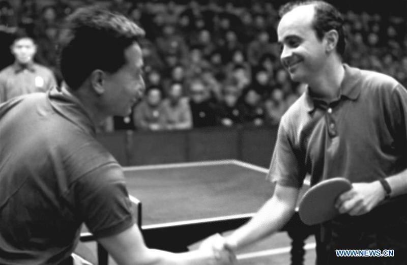 File photo taken on April 15, 1971 shows Chinese table tennis player Yang Ruihua (L) shaking hands with U.S. athlete Dick Miles prior to a friendship match, who had met each other since the 1959 World Table Tennis Championships, in Shanghai, east China. Exactly 40 years ago, Beijing and Washington officially established diplomatic relations, thus ending nearly three decades of isolation, hostility and even confrontation between two big countries with a combined population of over 1 billion, and resetting the course of history and international politics. Just like the "Ping-Pong Diplomacy" that marked a thaw in China-U.S. relations, the establishment of diplomatic ties was another wise and resolute decision made by then Chinese and American leaders with great political courage and far-reaching vision. In the past four decades, their successors have followed their footsteps, guiding the China-U.S. relationship through all complexities and difficulties to maintain a generally steady and smooth development. [Photo/Xinhua]