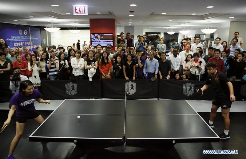 File photo taken on Sept. 16, 2017 shows Chinese table tennis player Wang Hao (front R) playing with ping-pong fans at a club in Chicago, the United States. Exactly 40 years ago, Beijing and Washington officially established diplomatic relations, thus ending nearly three decades of isolation, hostility and even confrontation between two big countries with a combined population of over 1 billion, and resetting the course of history and international politics. Just like the "Ping-Pong Diplomacy" that marked a thaw in China-U.S. relations, the establishment of diplomatic ties was another wise and resolute decision made by then Chinese and American leaders with great political courage and far-reaching vision. In the past four decades, their successors have followed their footsteps, guiding the China-U.S. relationship through all complexities and difficulties to maintain a generally steady and smooth development. [Photo/Xinhua]
