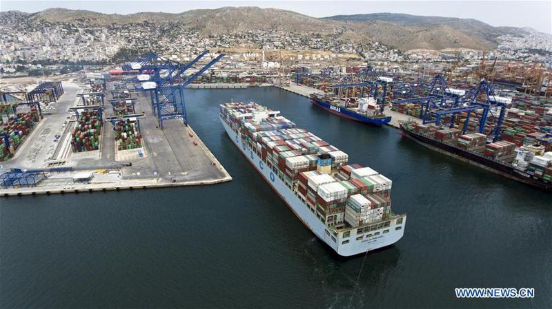 Photo taken on May 7, 2017 shows a COSCO ship leaving the Pireaus Port's container terminal in Greece. [Photo/Xinhua]