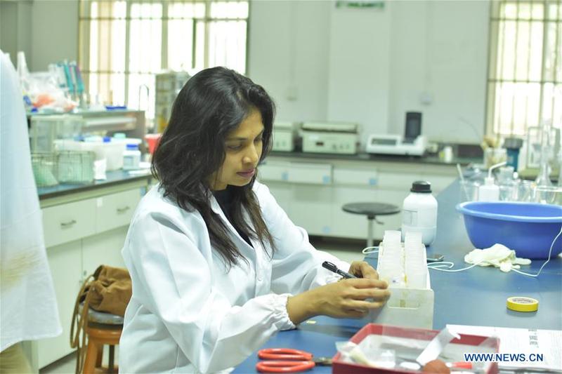 Darshika Hennayake, a graduate student from Sri Lanka, analyzes leachate samples of lettuce obtained from her research at the Soil Lab of Nanjing Forestry University in Nanjing, east China's Jiangsu Province, on May 17, 2019. [Photo/Xinhua]