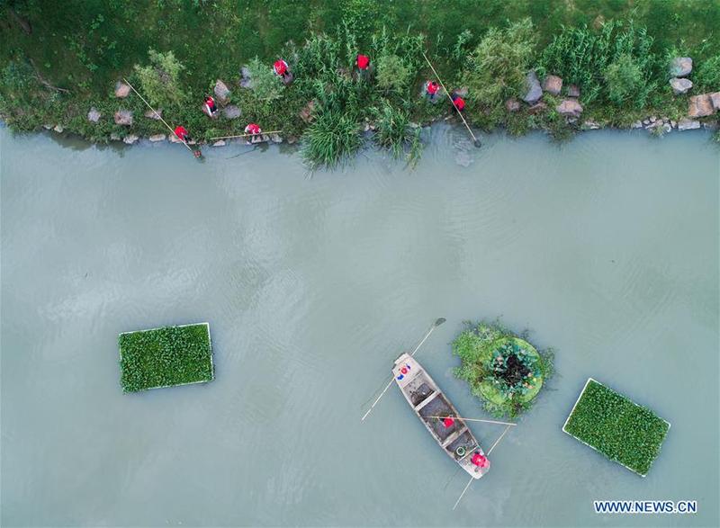 A river chief and sanitation workers patrol in Changxing County of east China's Zhejiang Province, Oct. 13, 2017. [Photo/Xinhua]