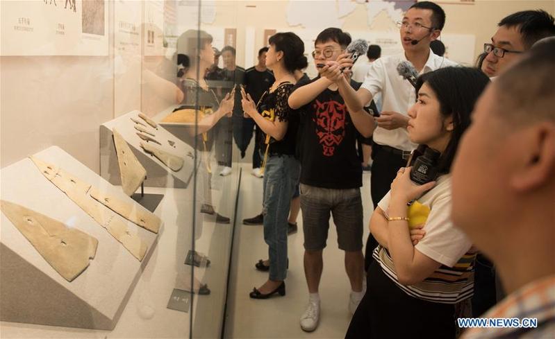 A staff member introduces the exhibits at Liangzhu Museum in Hangzhou, capital of east China's Zhejiang Province, June 22, 2019. China's Archaeological Ruins of Liangzhu City was on Saturday inscribed to the UNESCO World Heritage List as a cultural site, bringing the total number of the Asian country's sites on the list to 55. [Photo/Xinhua]