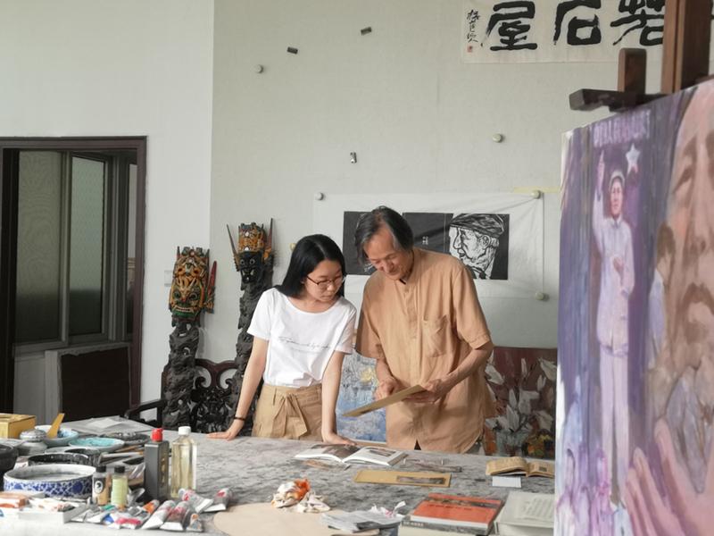 A crew member of the documentary, New China in Color, visits painter Wang Wei (R). [Photo provided to China Daily]