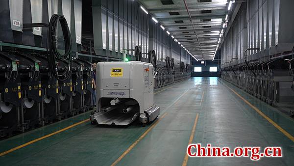 In the new production workshop, there are more than 10 IGVs (Intelligent Guided Vehicles) receiving instructions and transporting spools of chemical fiber to a designated position in a fast and orderly way. The whole process is simultaneously transmitted in 8K ultra-high definition to the company's production dispatch center.