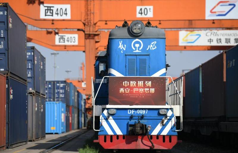A China-Europe freight train bound for Barcelona of Spain waits for departure in Xi'an, northwest China's Shaanxi province, April 8, 2020. [Photo/Xinhua]
