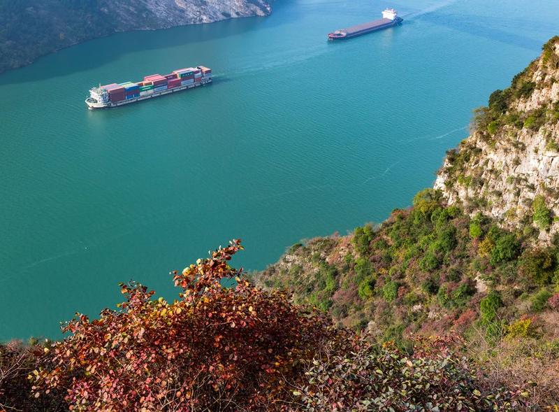 Ships sail through a section of the Xiling Gorge, one of the Three Gorges along the Yangtze River, in Zigui county of Yichang, Central China's Hubei province, Nov 29, 2020. [Photo/Xinhua]