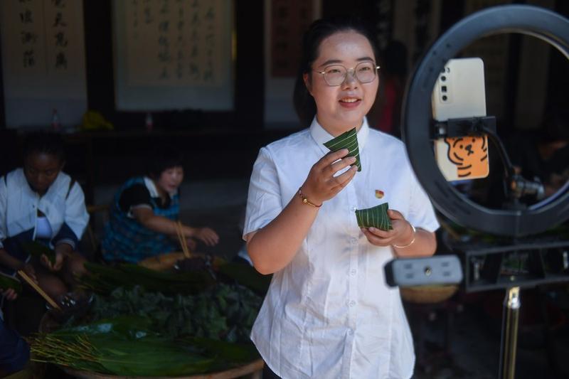 A Communist Party of China (CPC) member volunteers to help villagers promote local specialty via live-streaming in Huyuan Township of Hangzhou, east China's Zhejiang Province, June 8, 2021. (Xinhua/Xu Yu)