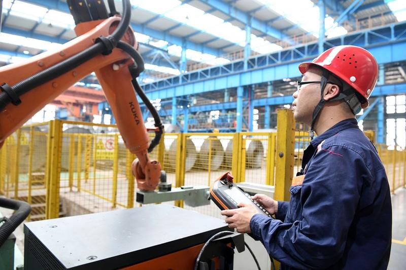 Communist Party of China (CPC) member Tang Longbo, who works at Guangxi Liuzhou Steel Group, checks an industrial robot arm in Liuzhou, south China's Guangxi Zhuang Autonomous Region, April 1, 2021. (Photo by Li Hanchi/Xinhua)