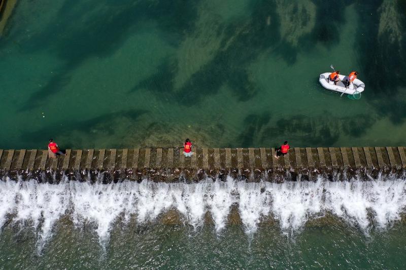 Aerial photo taken on July 6, 2021 shows volunteers, who are members of the Communist Party of China (CPC), cleaning the river in Yingfeng Village, Tuankou Township, Lin'an District of Hangzhou, east China's Zhejiang Province. (Xinhua/Xu Yu)