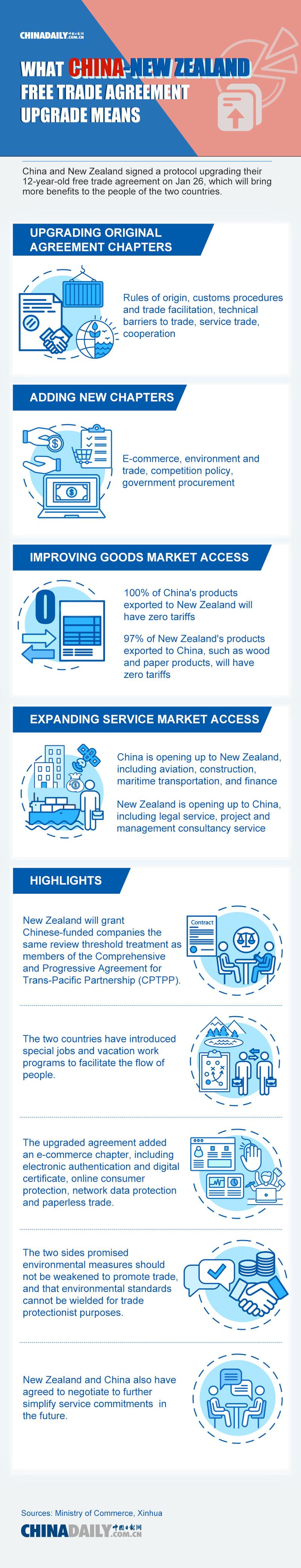 China and New Zealand signed a protocol upgrading their 12-year-old free trade agreement on Jan. 26, which will bring more benefits to the people of the two countries.
