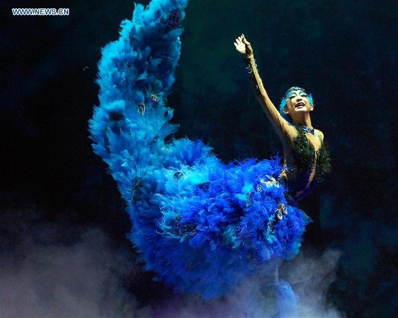 Rachel Gai, dancer from Houston Huaxing Arts Group, performs solo dance "The Auspicious Peacock" during the "Cultures of China, Festival of Spring" gala in Houston, the United States, Feb. 24, 2018. A grand Spring Festival gala was staged in Houston Saturday night for overseas Chinese and Americans to co-celebrate the Chinese Lunar New Year. [Photo/Xinhua]