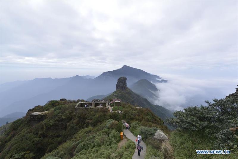 File photo taken on Oct. 4, 2015 shows tourists visiting Mount Fanjingshan in Tongren, southwest China's Guizhou Province. Mount Fanjingshan was inscribed to the World Heritage List on Monday at the 42nd World Heritage Committee meeting in Bahrain. It is the 13th site in China included on the World Natural Heritage List, making the total number of world heritage sites in China reach 53. [Photo/ Xinhua]