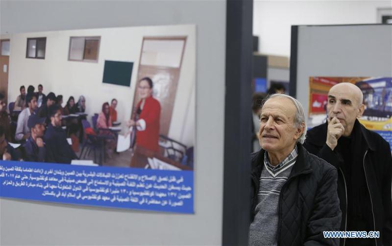 Visitors look at photos during a photo exhibition commemorating the 40th anniversary of China's reform and opening up in Beirut, Lebanon, on Jan. 30, 2019. The photo exhibition on the 40th anniversary of China's reform and opening up, jointly held by Chinese Embassy in Lebanon and the Lebanese Academy of Fine Arts, opened on Wednesday and will last till Feb. 2. [Photo/Xinhua]