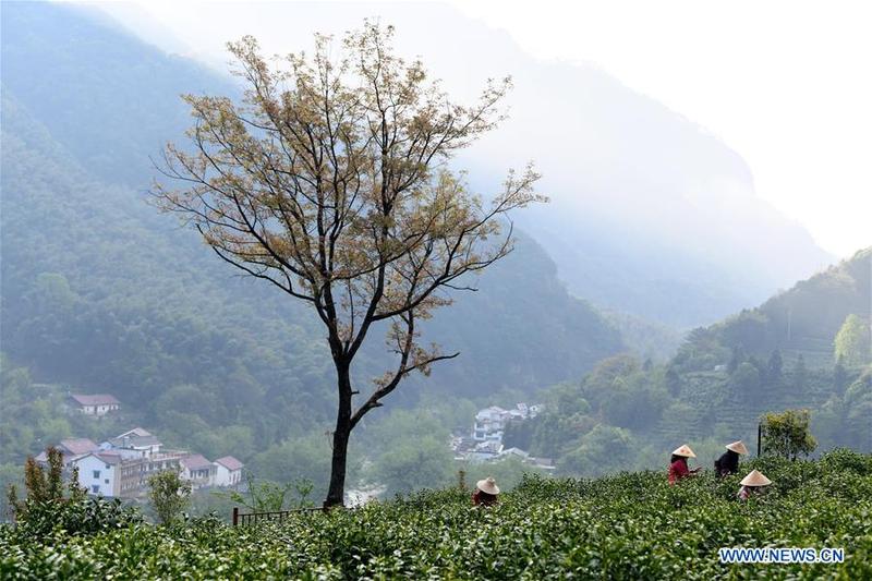 Farmers pick tea leaves in Tingxi Township of Jing County, east China's Anhui Province, on April 13, 2019. As an important part of Asian culture, tea is a special bond among Asian countries to deepen friendship and boost mutual exchanges. China will hold the Conference on Dialogue of Asian Civilizations starting from May 15. Under the theme of "exchanges and mutual learning among Asian civilizations and a community with a shared future," the conference includes an opening ceremony and sub-forums. [Photo/Xinhua]