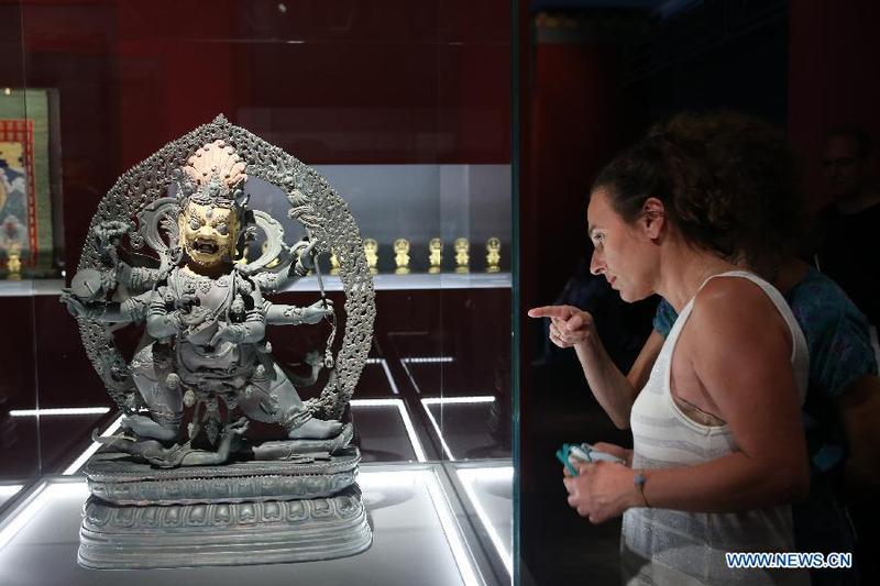 A bronze statuette of Mahakala is seen at the exhibition titled "From the Forbidden City: The imperial apartments of Qianlong" at the Acropolis Museum in Athens, Greece, on Sept. 12, 2018. The exhibition is organized by the Acropolis Museum in cooperation with the Palace Museum of Beijing. [Photo/Xinhua]