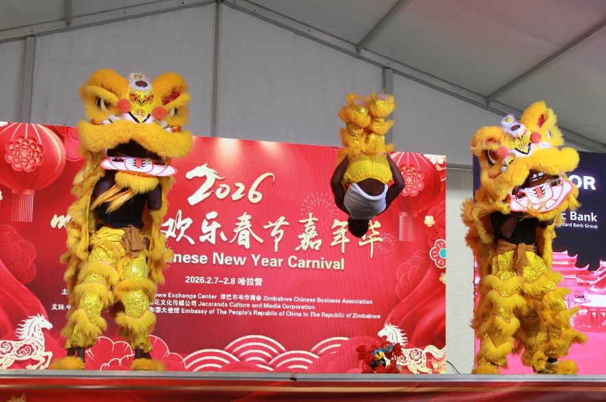 Zimbabwean artists perform traditional Chinese lion dance at a carnival to celebrate the Chinese New Year in Harare, Zimbabwe, on Feb. 7, 2026. Zimbabweans on Saturday were treated to Chinese cuisine and traditional performances at a carnival held in Harare, Zimbabwe's capital, to celebrate the upcoming Chinese New Year. (Photo by Tafara Mugwara/Xinhua)
