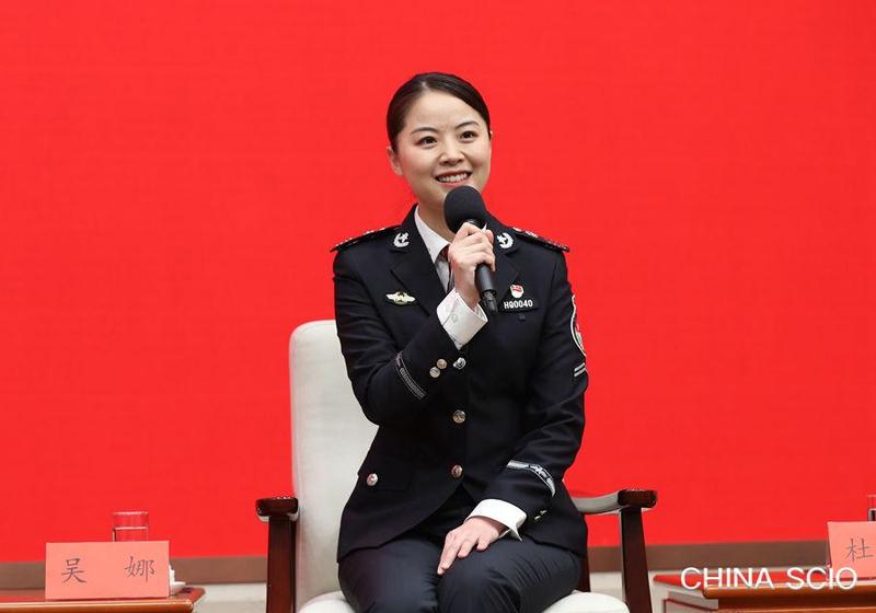Wu Na, Party secretary of the First Passenger Security Screening Division of the Security Check and Safety Protection Department at Hongqiao Airport Company of Shanghai Airport Authority and a person in charge of the "Wu Na Model Worker Innovation Studio," attends a group interview held by the Publicity Department of the Central Committee of the Communist Party of China in Beijing on July 6, 2021. [Photo by Xu Xiang/China SCIO]